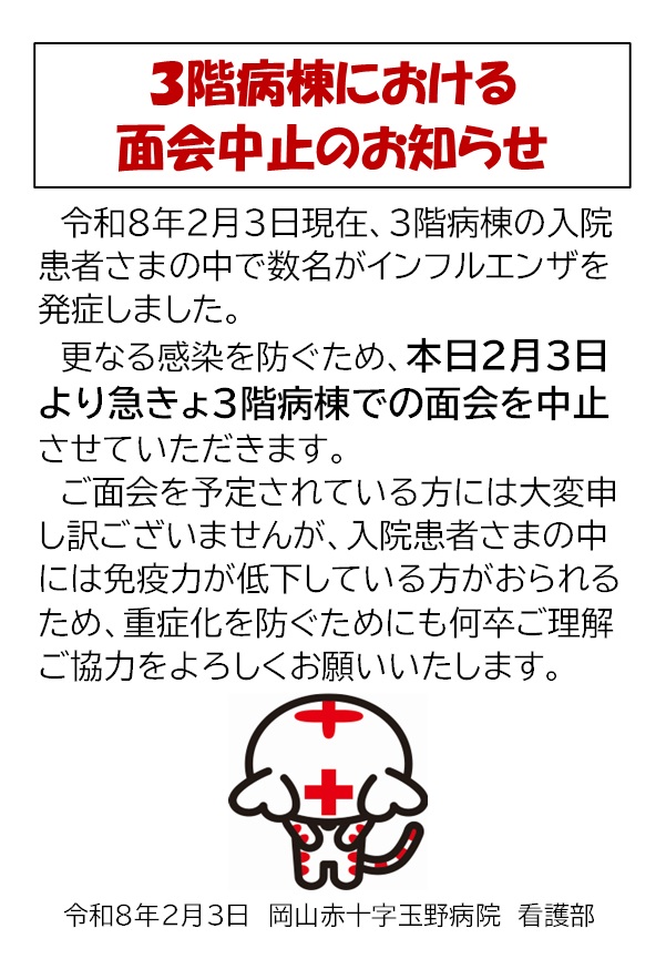 令和8年2月3日に3階病棟の入院患者様よりインフルエンザの感染発生が確認されたため、急遽2月3日より3階病棟に関して面会をしばらくの間中止とさせていただきますので、ご了承ください。