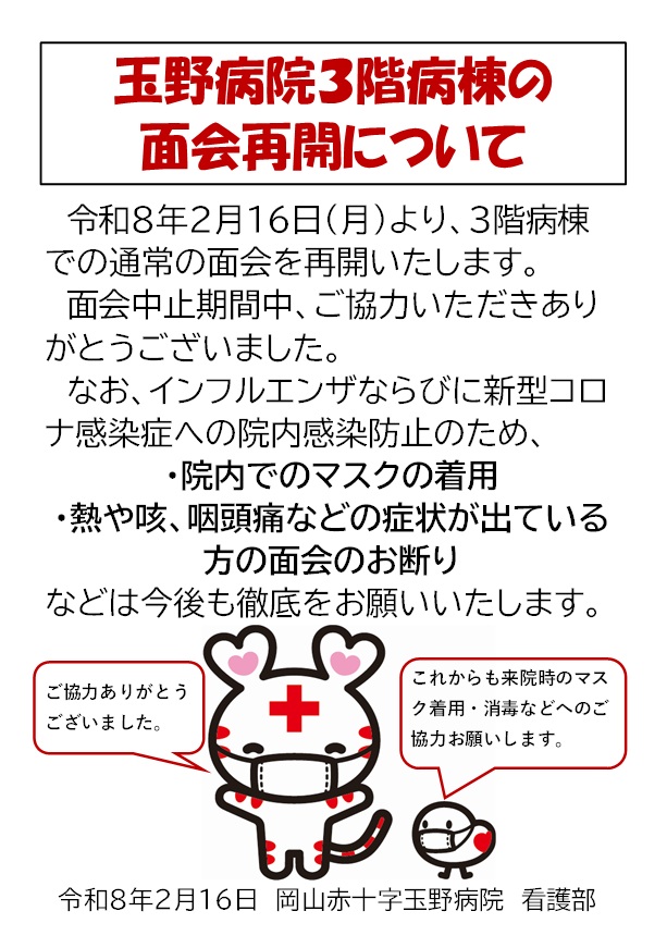 令和8年2月16日(月)より、3階病棟での通常の面会を再開いたします。