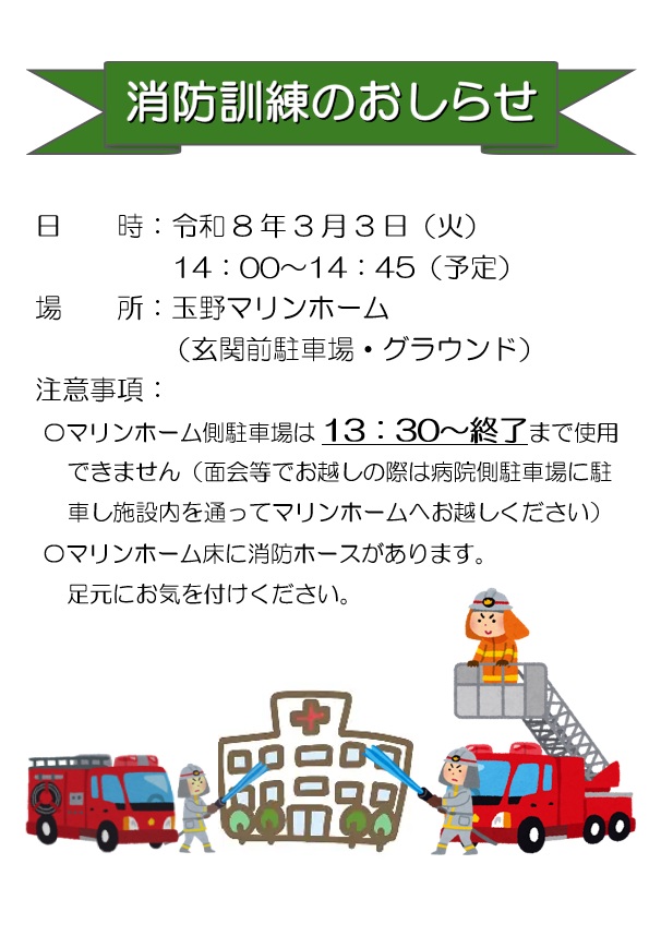 令和8年3月3日14時00分から14時45分まで老人保健施設玉野マリンホームにて消防訓練を実施します。